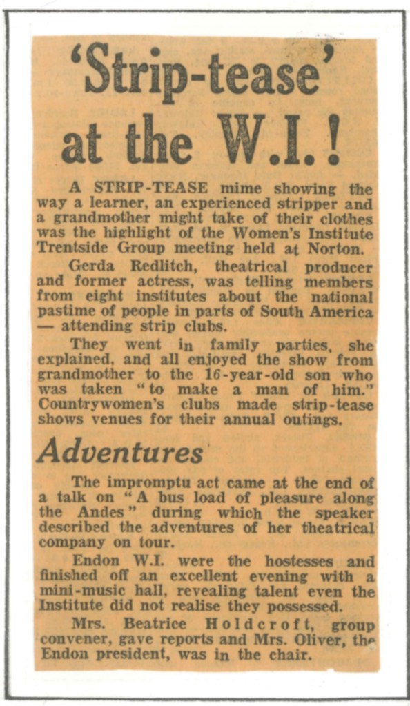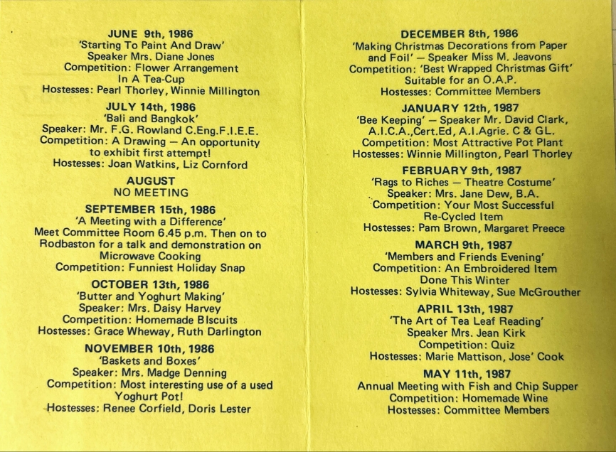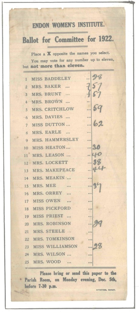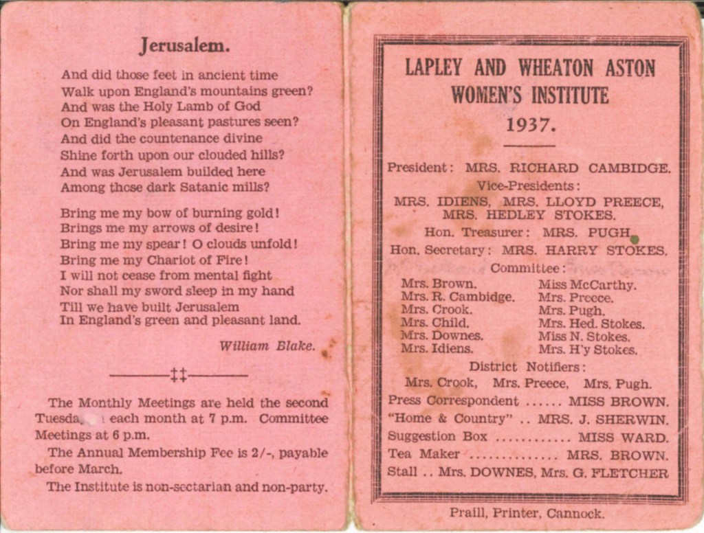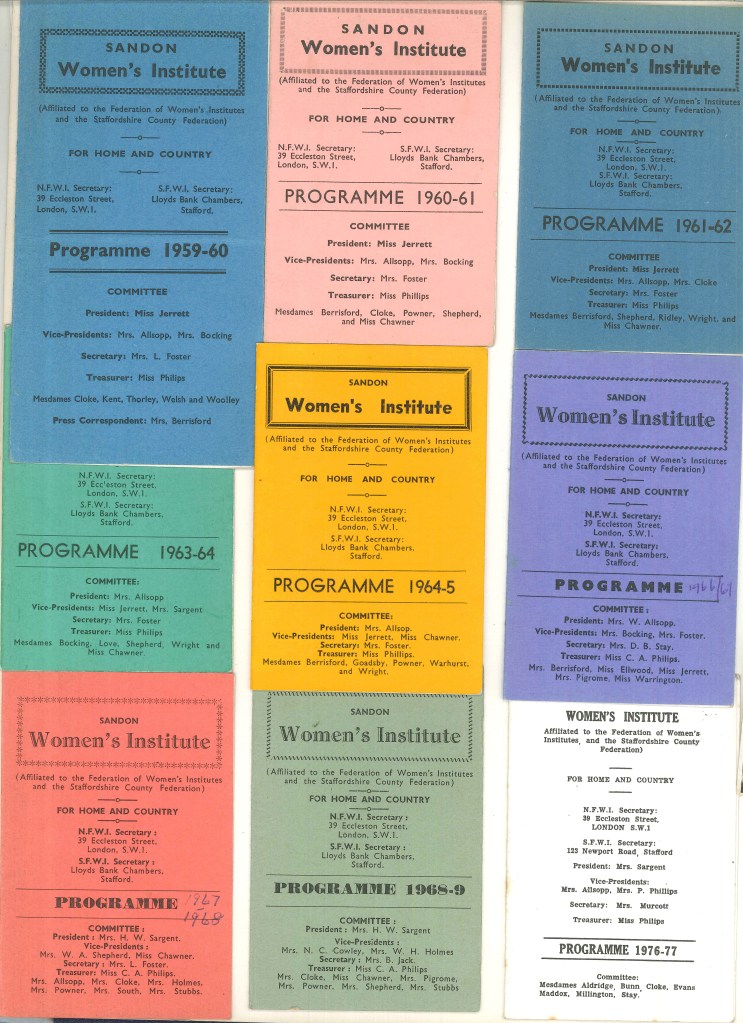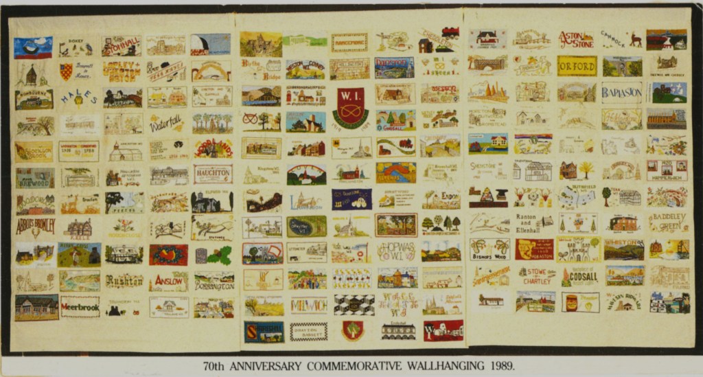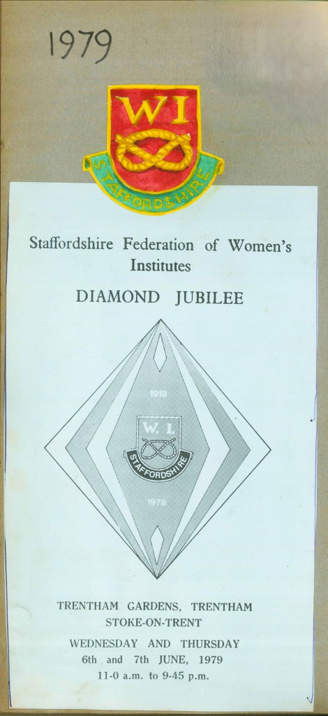 ‘Happy Haunting’ production by Lapley and Wheaton Aston WIBeatrix Potter Corner from the album of Sandon WI – 1987‘Les Girls’ of Lapley and Wheaton Aston WI110 WI WishesEndon WI Ballott from 19221979 Diamond Jubilee programme and painted badge from Barlaston WI‘Happy Haunting’ production by Lapley and Wheaton Aston WIA Poem from Sandon WI‘Les Girls’ of Lapley and Wheaton Aston WIA wedding at Lapley and Wheaton Aston WIEndon WI 1st Birthday PartyEndon WI photographs from the archives – chair mendingEndon WI photographs from the archives – dancingFamily picnic with Lapley and Wheaton Aston WIHanchurch WI Litter Picking CampaignHistorical costumes from Sandon WILapley and Wheaton Aston 1937 schedule (exterior)Lapley and Wheaton Aston 1937 schedule (interior)Image of Denman College from Hanchurch WI albumLapley and Wheaton Aston WI Lapley and Wheaton Aston group photographLapley and Wheaton Aston productionLapley and Wheaton Aston WI 1982 carnival photographsLapley and Wheaton Aston WI 1982 carnival photographsLapley and Wheaton Aston WI dress rehearsal for ‘Mad Hatters in Mayfair’Lapley and Wheaton Aston WI equal rights call by WI delegatesSandon WI 70th Anniversary PartyLapley and Wheaton Aston WI group photograph 1924Lapley and Wheaton Aston WI programme for 1986-87Miniature shop in a shoebox from the album of Sandon WI – 1987Sandon Hall postcard of WI in WW1Sandon WI 1920 bannerSandon WI keep fitSandon WI programmes through the yearsShugborough parade taken by Sandon WITaken back to childhood newspaper clipping from the Barlaston WI album70th Anniversary Commemorative Wall Hanging 1989 featuring all the banners of the WIs in StaffordshireSandon WI Membership cardLapley and Wheaton Aston WI dress rehearsal for ‘Mad Hatters in Mayfair’The Book Cover of Hanchurch WIThe WI at 100 magazine cover